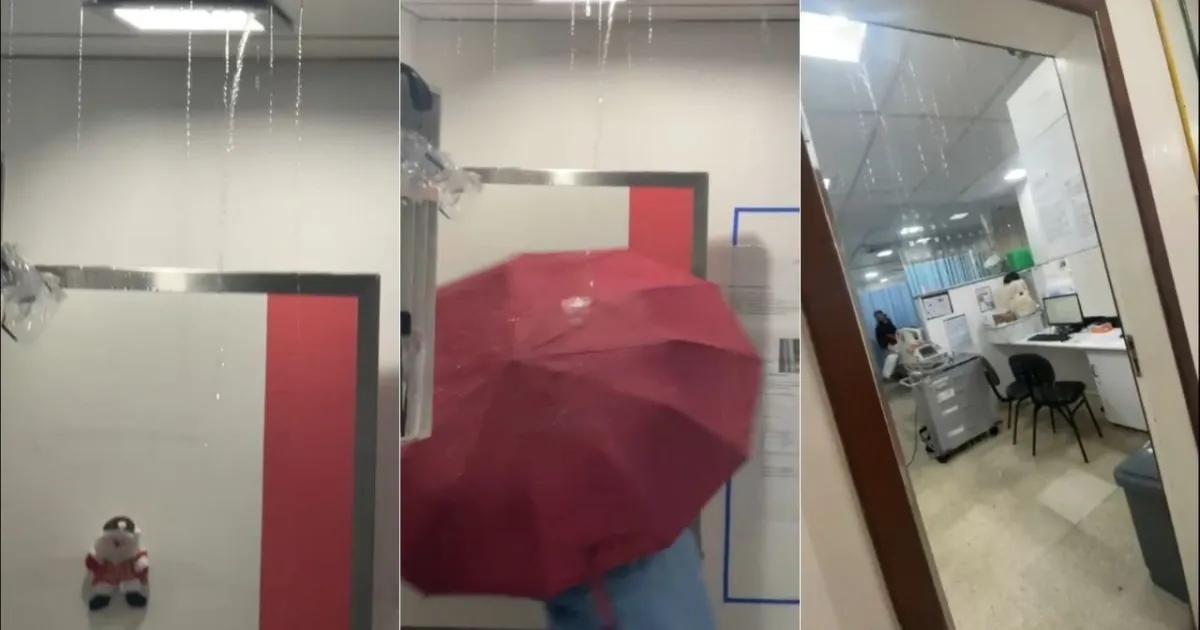 Um dos registros mostra uma profissional da equipe hospitalar com um guarda-chuva na tentativa de escapar da forte goteira que atingia a sala. Outro apresenta a equipe de limpeza que tenta reduzir os danos com rodos para escoar o líquido.